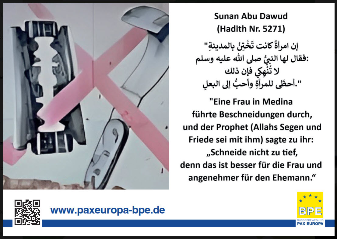 Bei öffentlichen Diskussionen bestreiten viele Moslems gerne, dass diese Frauenbeschneidung im Islam durch Mohammed legitimiert wurde. Beispielsweise bei der BPE-Kundgebung in Düsseldorf zur Aufklärung über den Politischen Islam am Samstag, den 23. August 2025, bei der der Islam-Experte Irfan Peci mit Moslems darüber redete. Das Video darüber hat bei dem YouTube-Kanal „Augen auf!“ bereits über 25.000 Aufrufe: