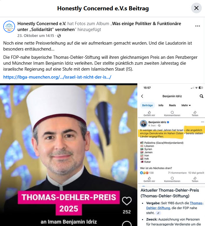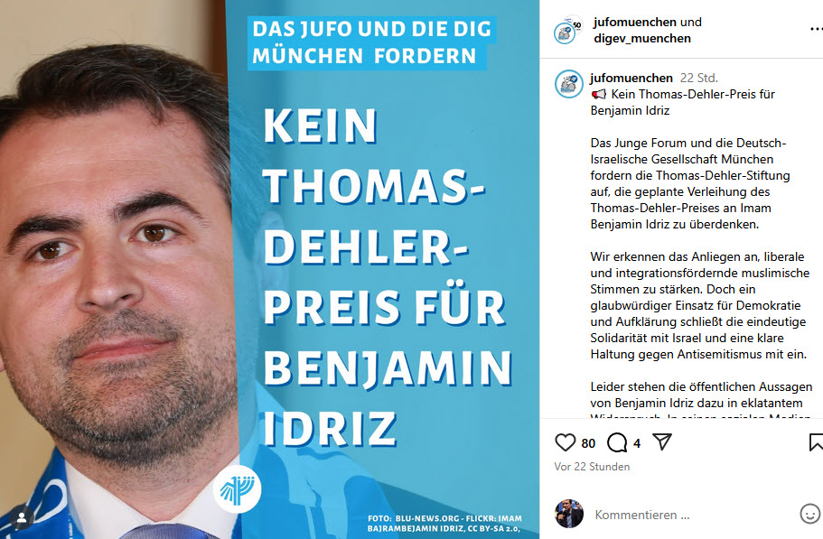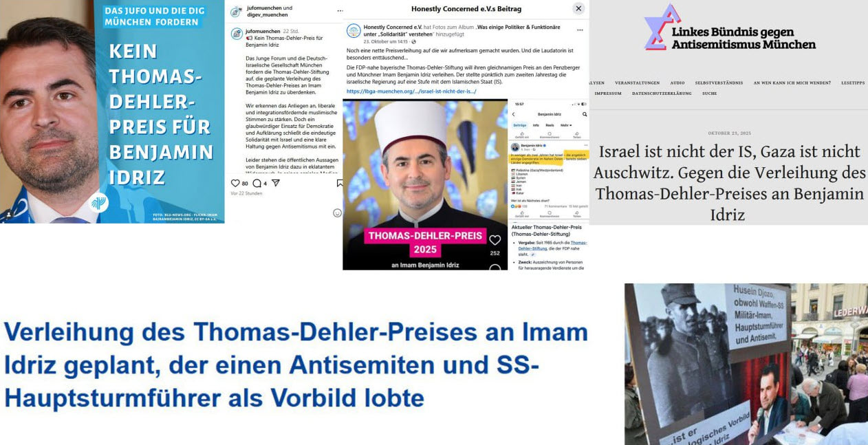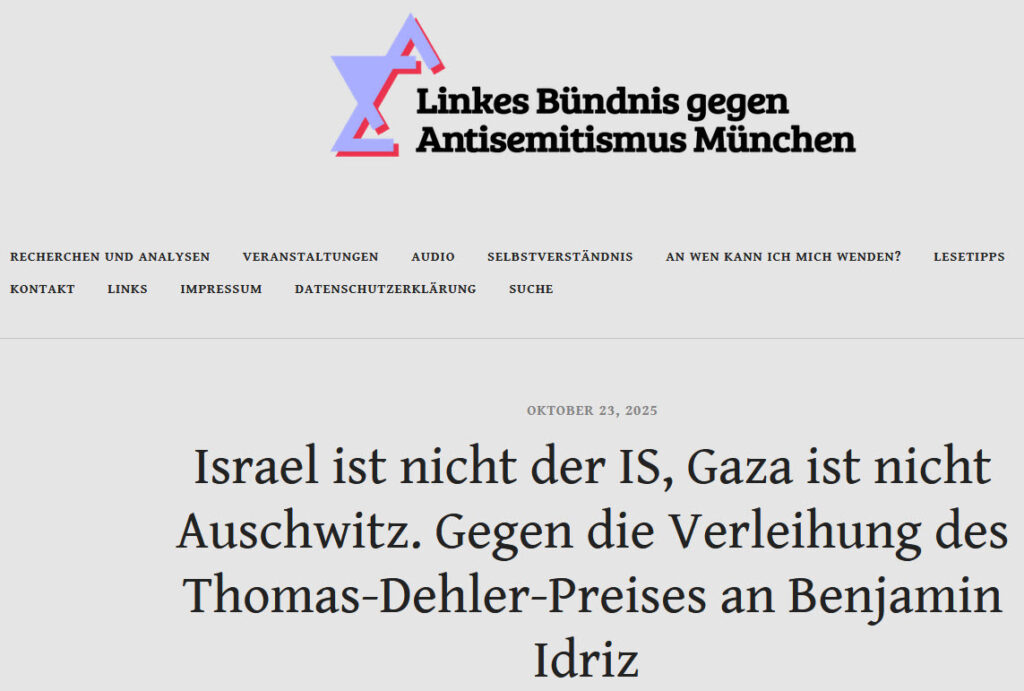 Dieses „Linke Bündnis gegen Antisemitismus“ nimmt seit Jahren eine kritische Haltung zu Imam Idriz ein und positioniert sich seit dem 23. Oktober auch folgerichtig klar gegen diese Preisverleihung: